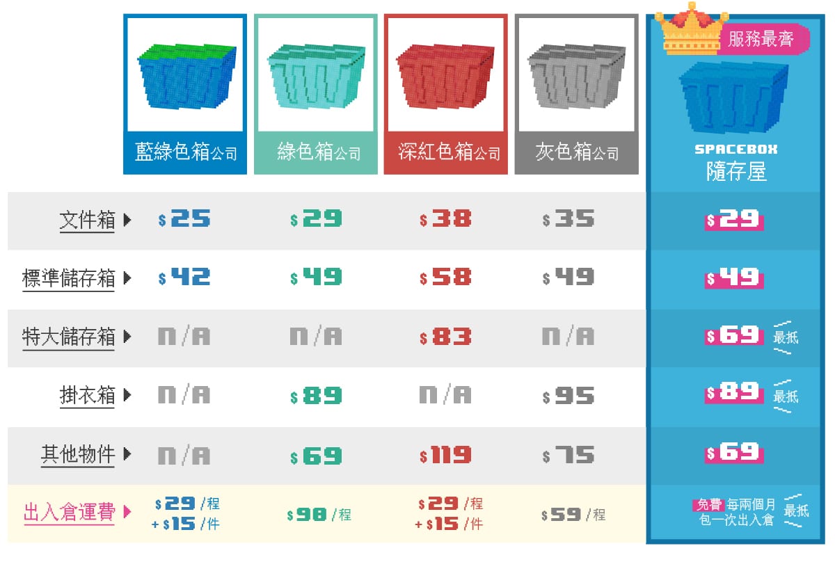 淨係睇每箱每月嘅價錢係唔夠㗎,仲要睇埋運費,而家好多公司都會免第一次入倉運費,但如果中間要做出入倉提存就會逐項收費。就以上面幾間儲存箱公司為例,出入倉來回運費平均都要畀$100。睇番Spacebox隨存屋係少見地每兩個月包一次出入倉,運費呢啲少數怕長計,咁樣計落都慳咗幾餐lunch錢㗎!